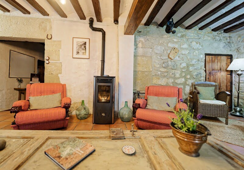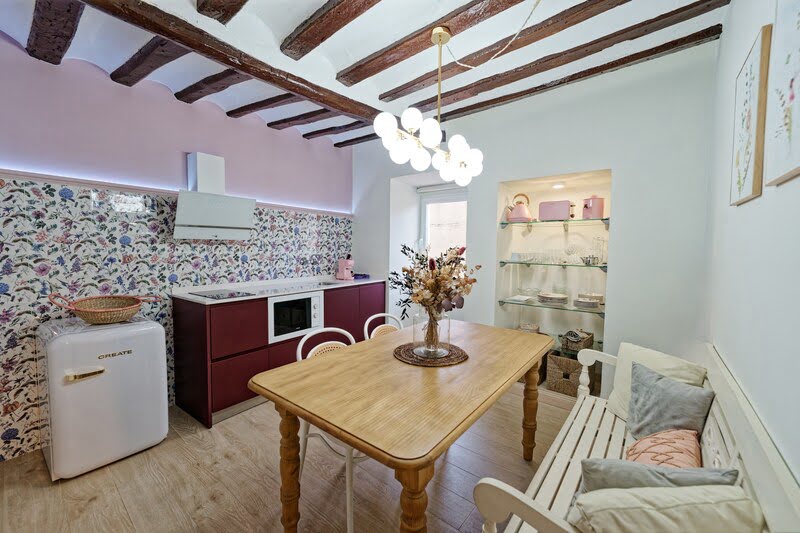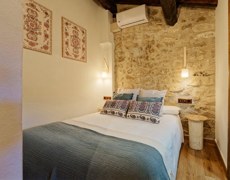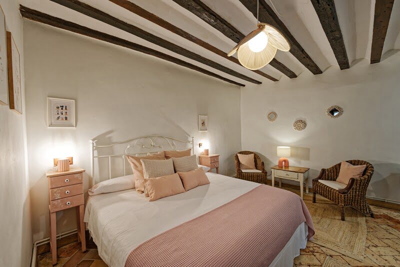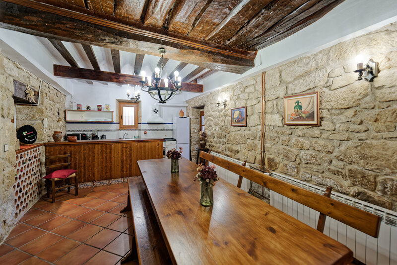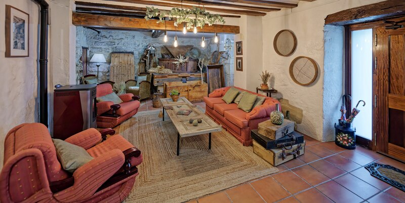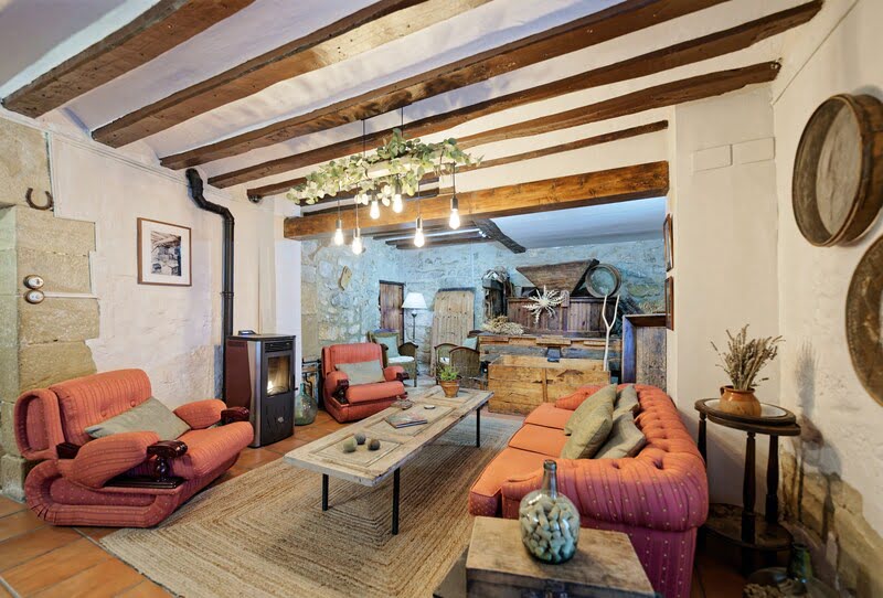 La piedra y la madera original se combinan con una decoración cuidada y acogedora, mientras el antiguo molino eléctrico de los años 60 aporta carácter y personalidad a la casa.
